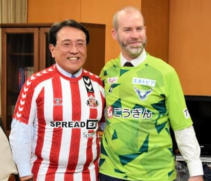 赤沢氏は、「私の地元にリーグ3のチームがある」とユニホームを手渡した。レイノルズ氏からはイングランド2部リーグの古豪サンダーランドのユニホームを受け取り「太っているから着られるかな」と苦笑いしつつ、笑顔で撮影に応じた。