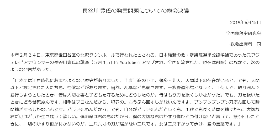 問題点は、長谷川豊さんが下級身分の人々を「一族野盗郎」で「暴行」をはたらく「犯罪」の「プロ」として説明している箇所にあったとされています。