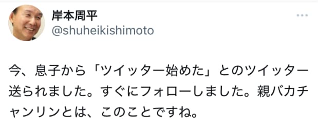 岸本周平さんの2009年12月21日のX(当時Twitter)には、「息子からツイッターを始めたよーと連絡が来た」と投稿されているため、少なくとも息子がいることが確認できます。