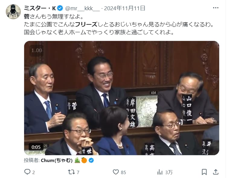 たまに公園でこんなフリーズしとるおじいちゃん見るから心が痛くなるわ。引用:Xより(2024.11.11)
