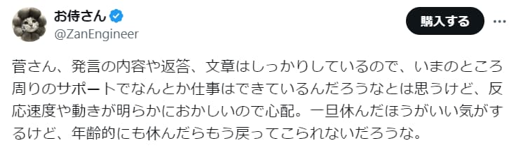菅さん、発言の内容や返答、文章はしっかりしているので、いまのところ周りのサポートでなんとか仕事はできているんだろうなとは思うけど、反応速度や動きが明らかにおかしいので心配。