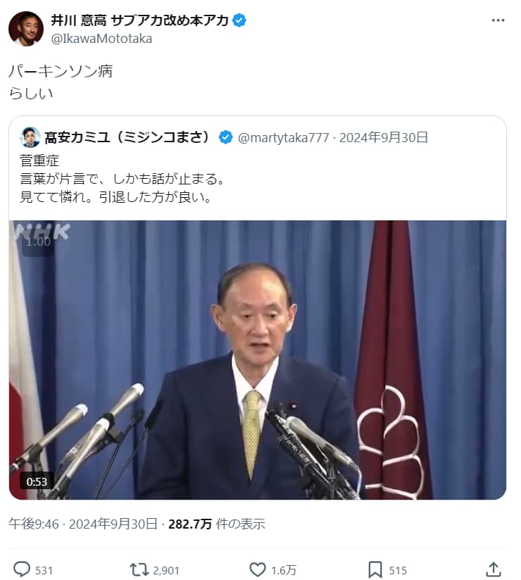 菅義偉さんの健康不安説は度々噂がありましたが、「パーキンソン病」と噂が広まったのは、おそらく大王製紙の元社長の井川意高さんが2024年9月30日にX投稿したことが始まりだと考えられます。