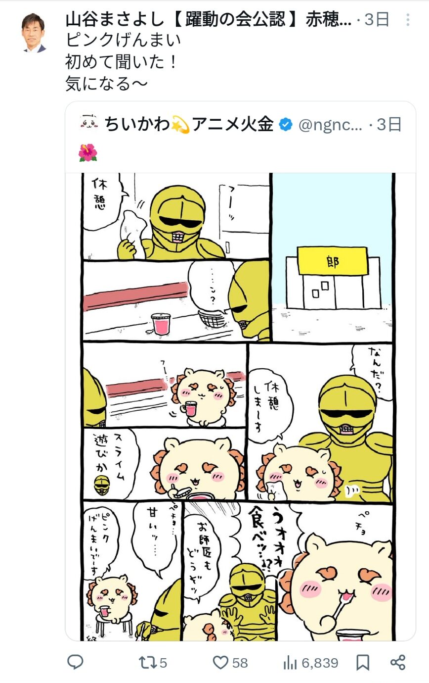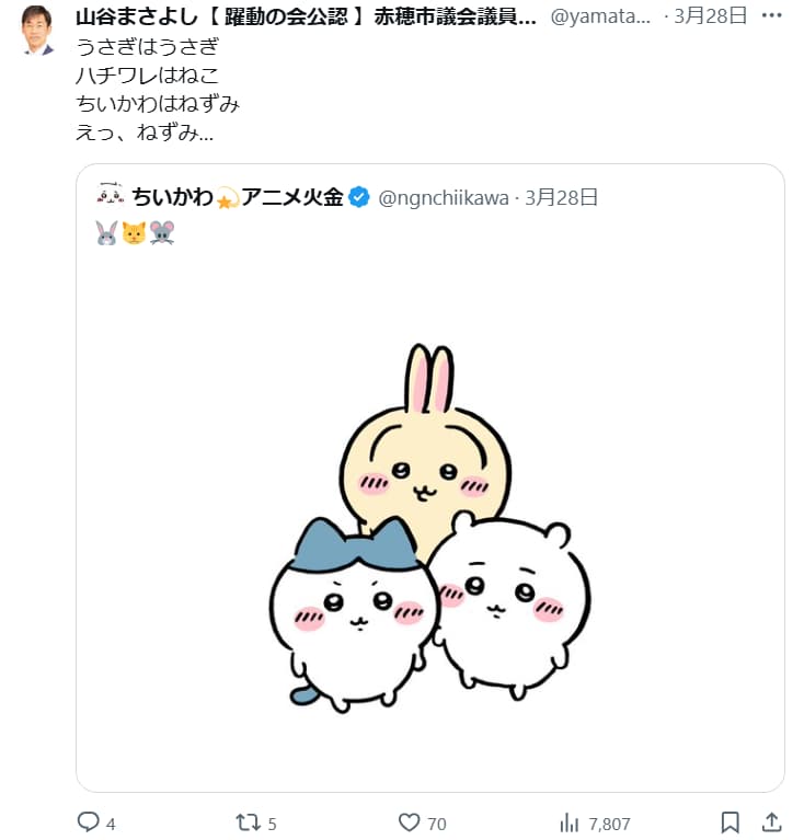 山谷まさよしさんの趣味の中でも、特に話題なのが「ちい活」で、アニメ『ちいかわ』の漫画をXに投稿して素朴なコメントを入れているのが親近感を感じさせますね!